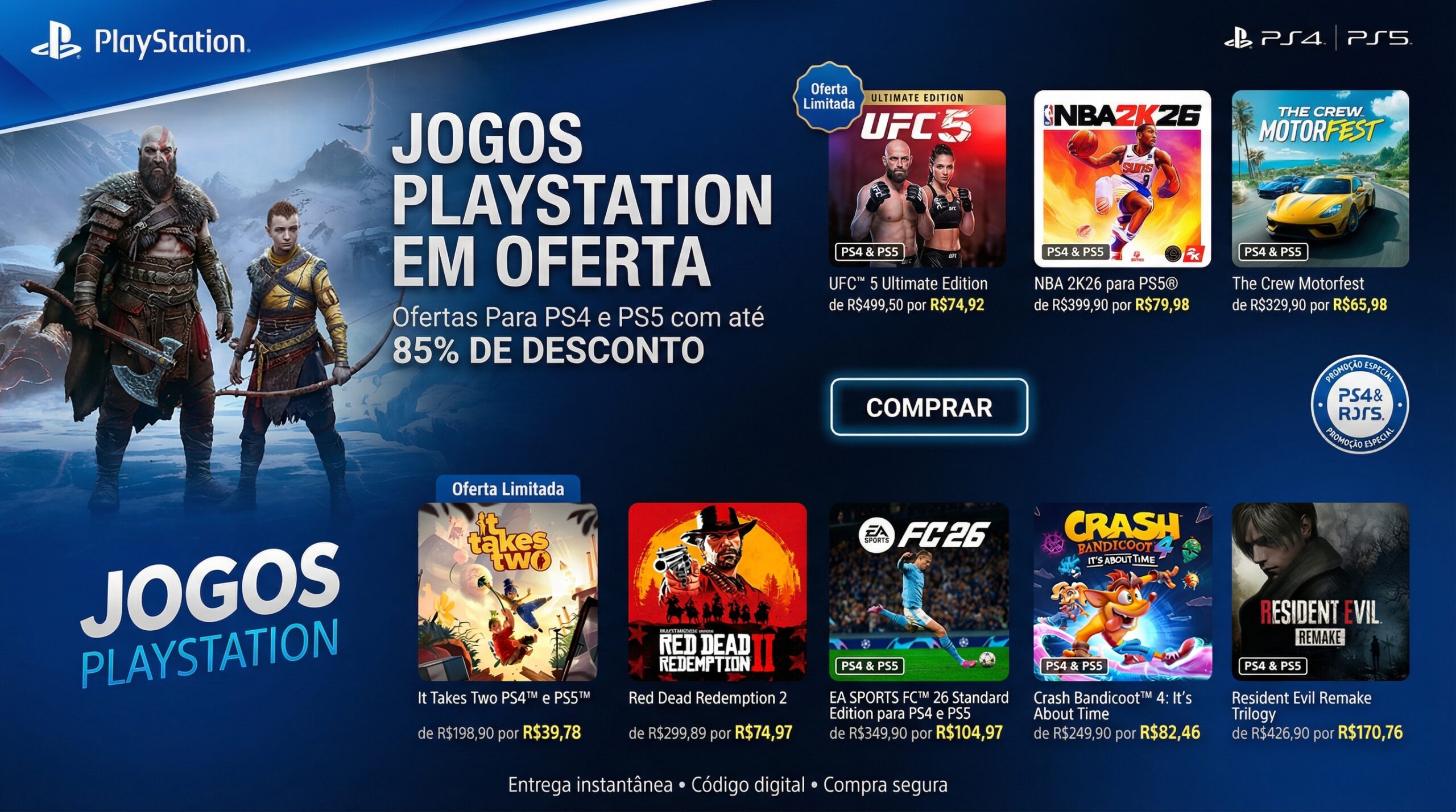 Descontos em jogos do universo PlayStation e recarga de PSN na hora. Entrega automática 24/7, rápido e seguro.