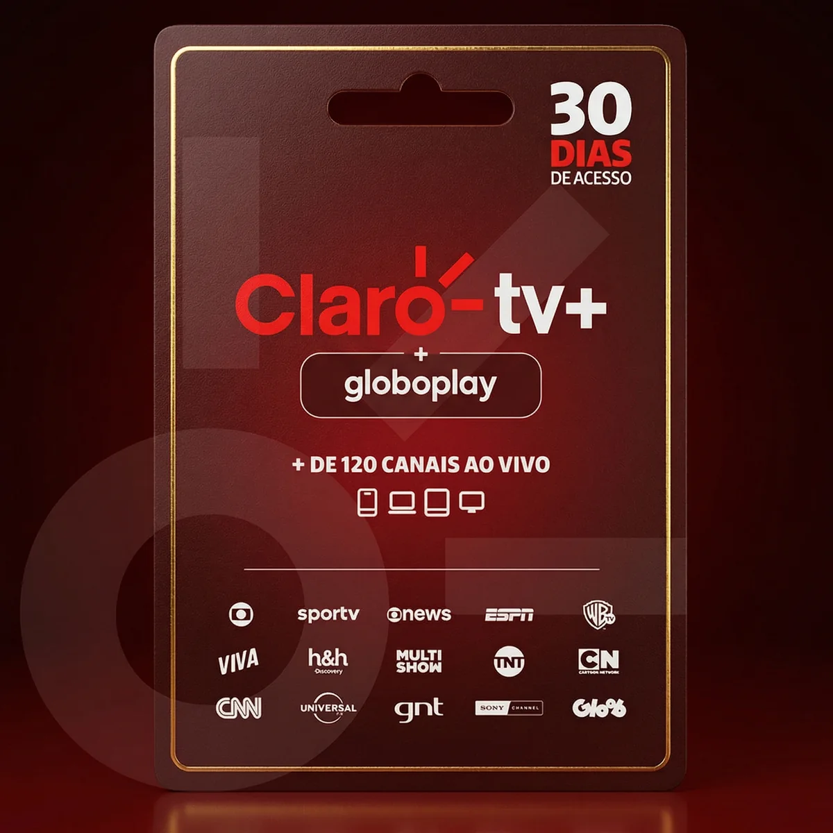 O Cartão Presente Claro TV+ é um cartão que permite acesso ao conteúdo do App Claro TV+ com Globoplay, por 30 dias, pelo valor único de R$74,90. Tenha acesso a mais de 120 canais da TV por assinatura, além de mais de 50 mil conteúdos on demand para assistir quando quiser e acesso ao app Globoplay.