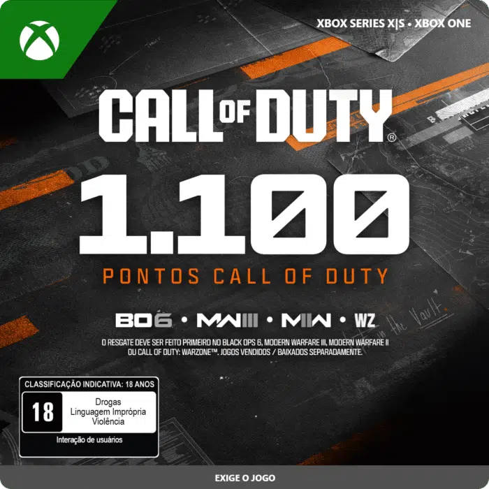 Call of Duty Points 1100 adiciona 1100 COD Points à sua conta para Modern Warfare III, Warzone e títulos compatíveis; assim, você compra Battle Pass, saltos de nível e pacotes da Loja (operadores, projetos de arma e mais). Além disso, o saldo segue a plataforma informada no produto (Xbox, PlayStation ou PC) e aparece no jogo após o resgate.