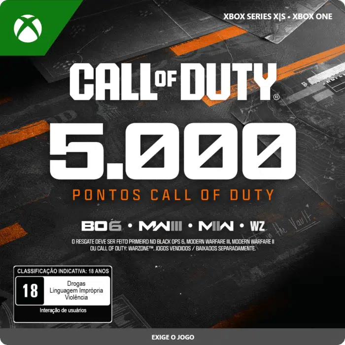 Call of Duty Points 5000 adiciona 5000 COD Points à sua conta para Modern Warfare III, Warzone e títulos compatíveis; assim, você compra Battle Pass, saltos de nível e pacotes da Loja (operadores, projetos de arma e mais). Além disso, o saldo segue a plataforma informada no produto (Xbox, PlayStation ou PC) e aparece no jogo após o resgate.