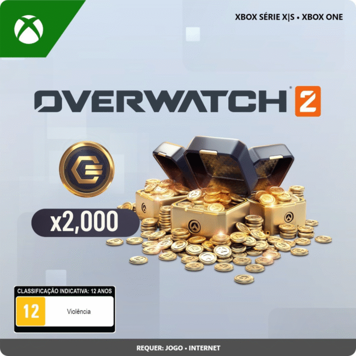 Overwatch 2 – 2.000 Moedas de Overwatch adiciona 2.000 Coins à sua conta para você desbloquear o Passe de Batalha Premium, adiantar níveis (Tier Skips) e comprar skins, visuais e pacotes na loja do jogo.