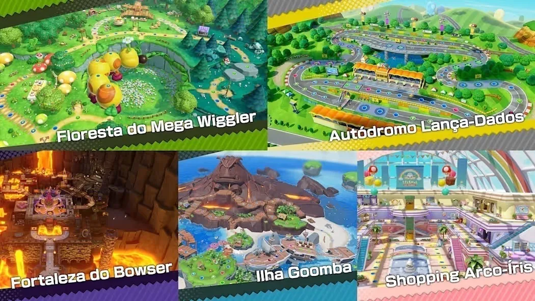 Tire onda na Ilha Goomba, procure estrelas no Shopping Arco-Íris ou revisite os clássicos do Povoado Faroeste e Castelo Arco-Íris do Mario. Com 22 personagens, incluindo novas adições como Pauline e Ninji, há algo para todo tipo de festeiro!